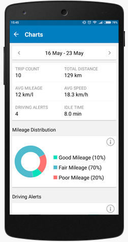 Get a detailed view of your vehicle history in terms of mileage distribution and idle time.